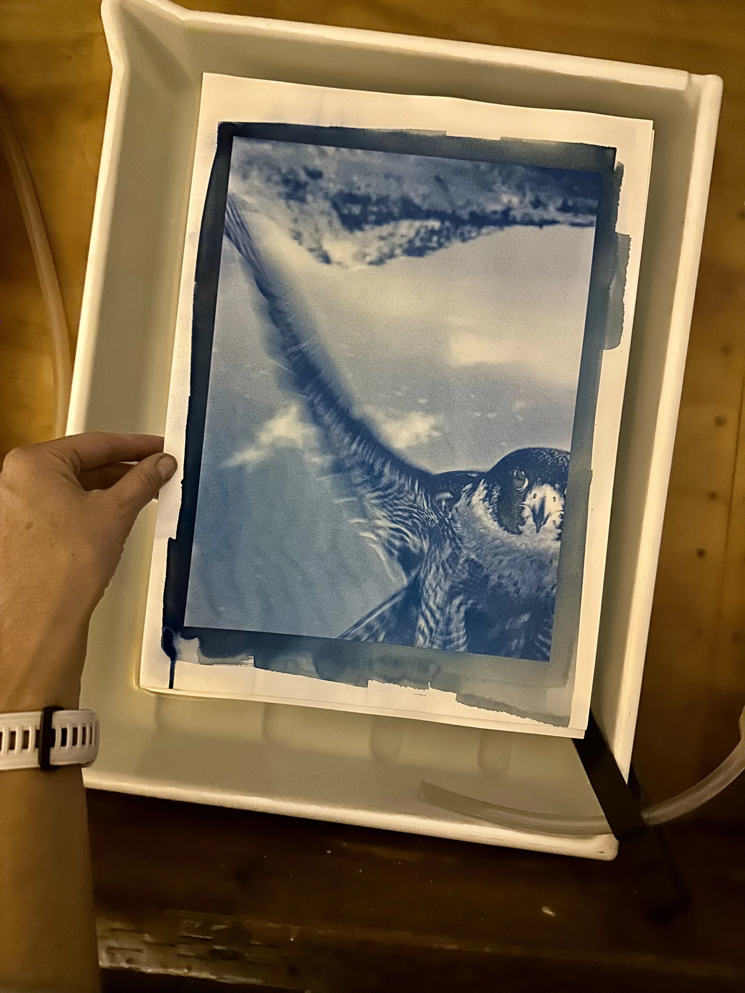 Each composition begins as a medium format digital photograph, composed practically in-camera, then contact-printed by hand using an analog process. The birds, living, breathing individuals, were photographed in collaboration with HawkWatch International, a conservation organization that monitors raptor populations across the world as indicators of ecosystem health. The resulting compositions are assembled from tiled cyanotype prints on cotton paper, creating large-scale, physical works whose imperfections—brush strokes, tonal shifts, slight paper warps—underscore the labor of their making and the tactility of their imagining.